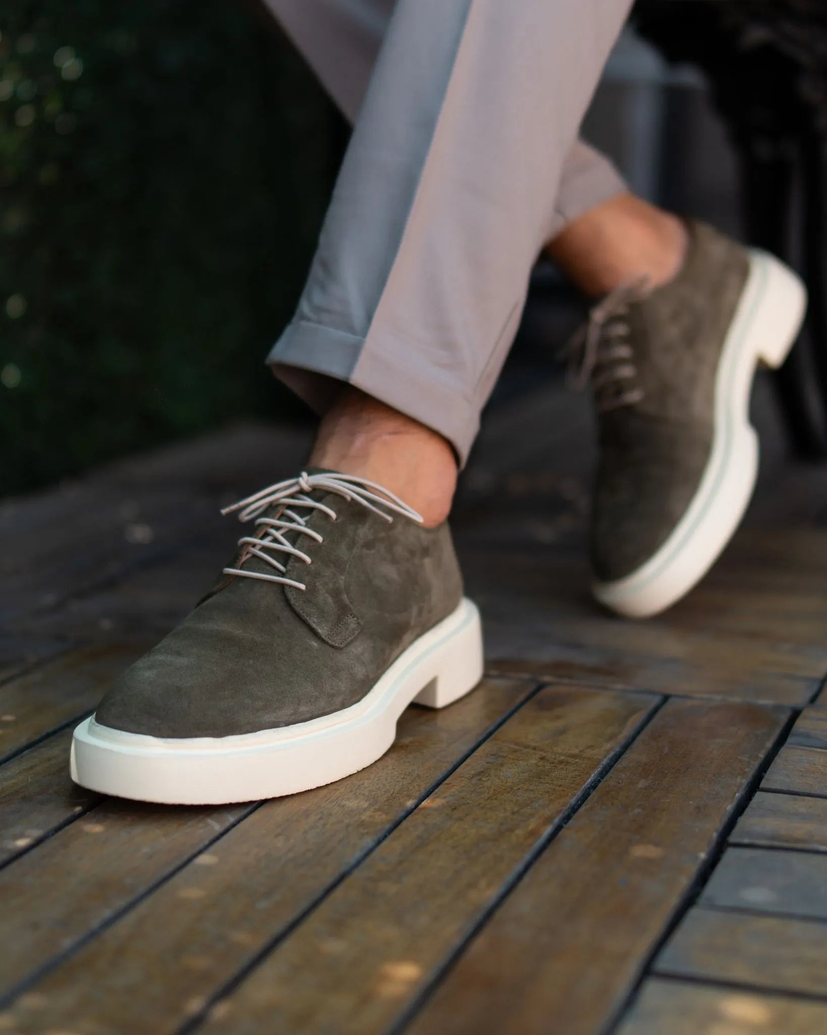 Découvrez la parfaite fusion entre sophistication classique et modernité urbaine avec ces derbies audacieuses en daim kaki.